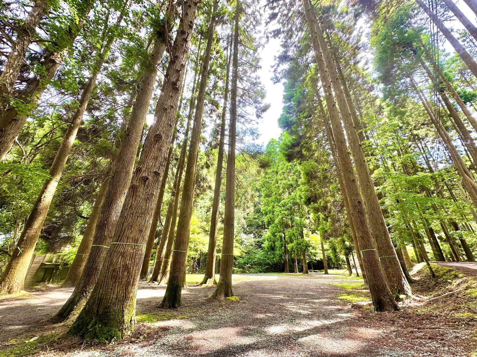 名勝「鹿ヶ壺」のふもと付近に広がる、木々に囲まれたフリーサイト。すぐそばには川が流れ、川遊びも楽しめます。車はサイトの近くに駐車が可能です。