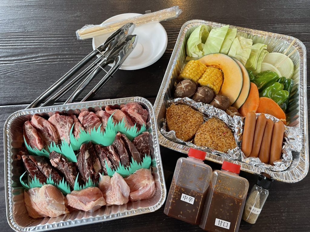 お1人あたりお肉250g(やわらかハラミ、やわらかカルビ、鶏モモ)、ウインナー、野菜、焼きおにぎり、タレ(甘口、中辛)、塩コショウ