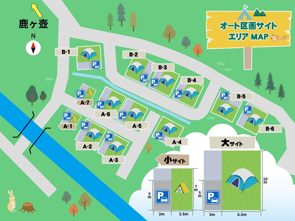 ※電源利用の場合追加料金600円。ご希望の方は、オプション欄からお申込みください。 - 小サイトの定員は3名様ですが、同居家族の場合のみ5名様まで、大サイトの定員は5名様ですが、同居家族の場合のみ7名様まで利用可能です。(ご予約に備考欄にて予約人数を超える場合はお知らせください)